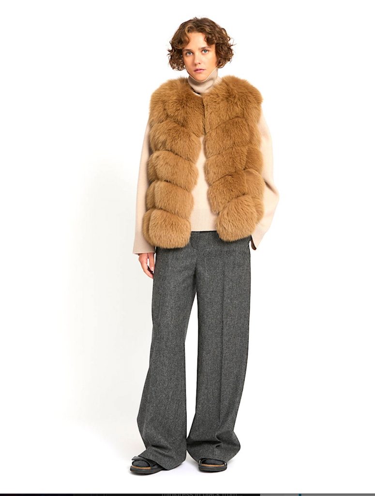 A fresh take on the sleeveless waistcoat, this swanky camel-hued vest emits a chill and resolutely assertive energy. Revealing two slit pockets, a hook fastening, and a lightweight finish, it is fabricated from fur in a chevron pattern, providing texture and a graphic aesthetic. $3,310, us.yves-salomon.com