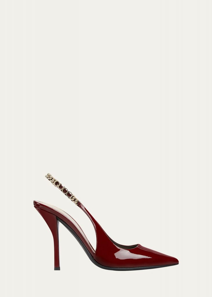 Glossy patent leather and an architectural shape give these pumps undeniable power. Finished with the house’s signa ture chain and a sultry stiletto heel, they’re a contemporary ode to Gucci’s Florentine roots. $1,200, bergdorfgoodman.com