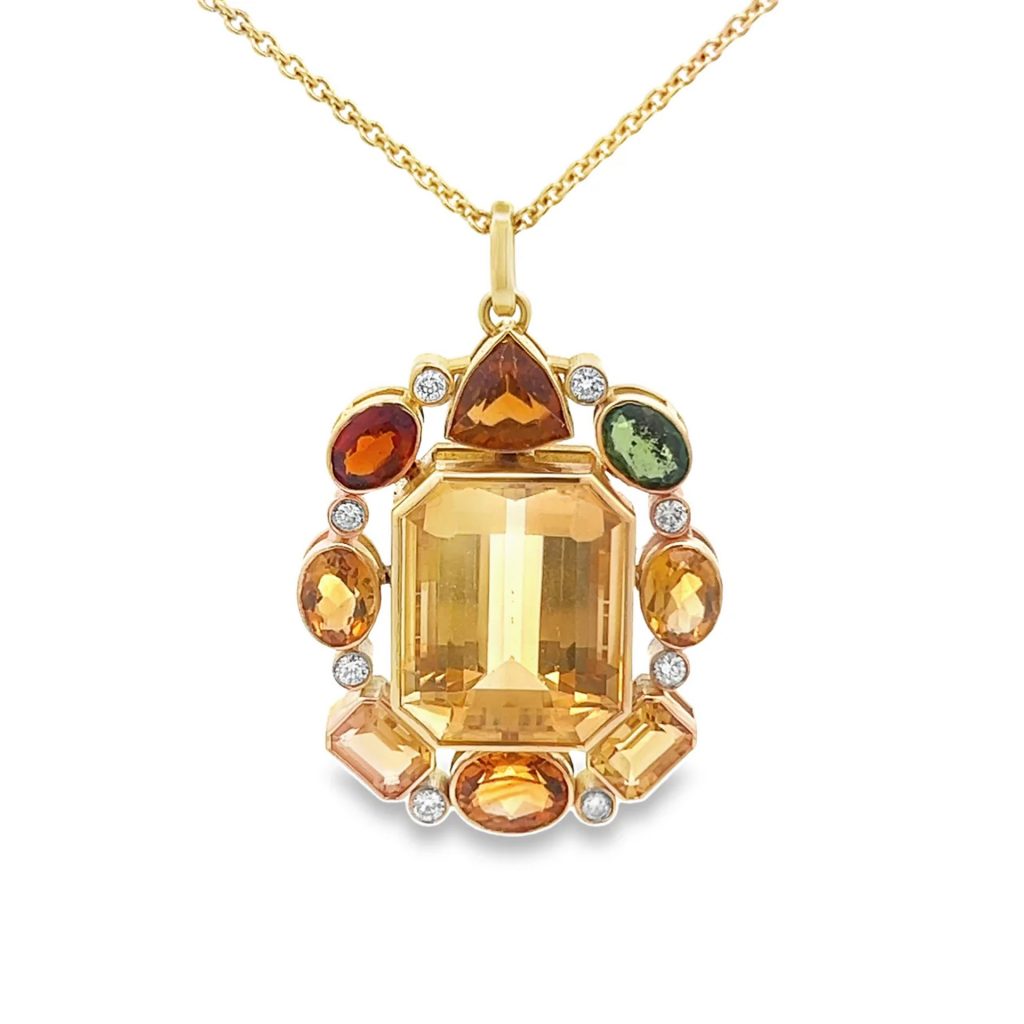 Whether adding a spot of color to your soirée-season LBD or elevating your finest cashmeres, this 18K yellow gold pendant is a study in refined opulence. Centered around an emerald-cut citrine flanked by round diamonds and multicolor stones, its warm, amber and jewel-toned palette glows softly against the skin, finished with a classic cable chain. $9000, yanina-co.com