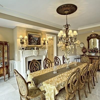 The home’s signature rounded doorway flows into the dining room, which is large and classically inspired, with a white fireplace encrusted in elegant mouldings and a dining table that seats ten easily. The beige walls accent the white mouldings and Schoenbeck chandelier, brought from the couple’s previous home.