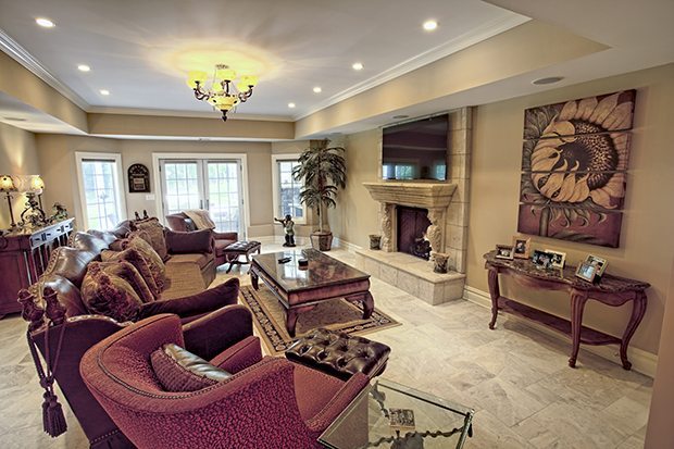 The large living room’s focal point is the Brazilian granite marble fireplace (also seen in the family room’s bar). A large flat screen TV faces deep, overstuffed couches, while recessed lighting and French doors to the outside illuminate the room.