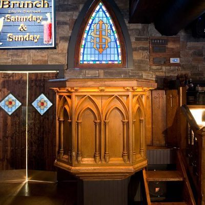 In considering the appropriate appointments for his Bay Ridge ode all things Hibernian, Michael Dorgan didn’t stop at shamrocks and shandy. To outfit the Wicked Monk, now twenty three years ago, he imported a hand-carved back bar, stained-glass windows, a pulpit, gargoyles, and wooden pews from a monastery in Cork City, Ireland, then recruited artist Igor Korotash to produce a 36-foot-long ceiling painting in which friends and employees are depicted, along with flying monks. The bar moved from its original digs to a larger space in the same neighborhood in 2012, but kept all the sacred décor, and even re-commissioned the artist to update his work.