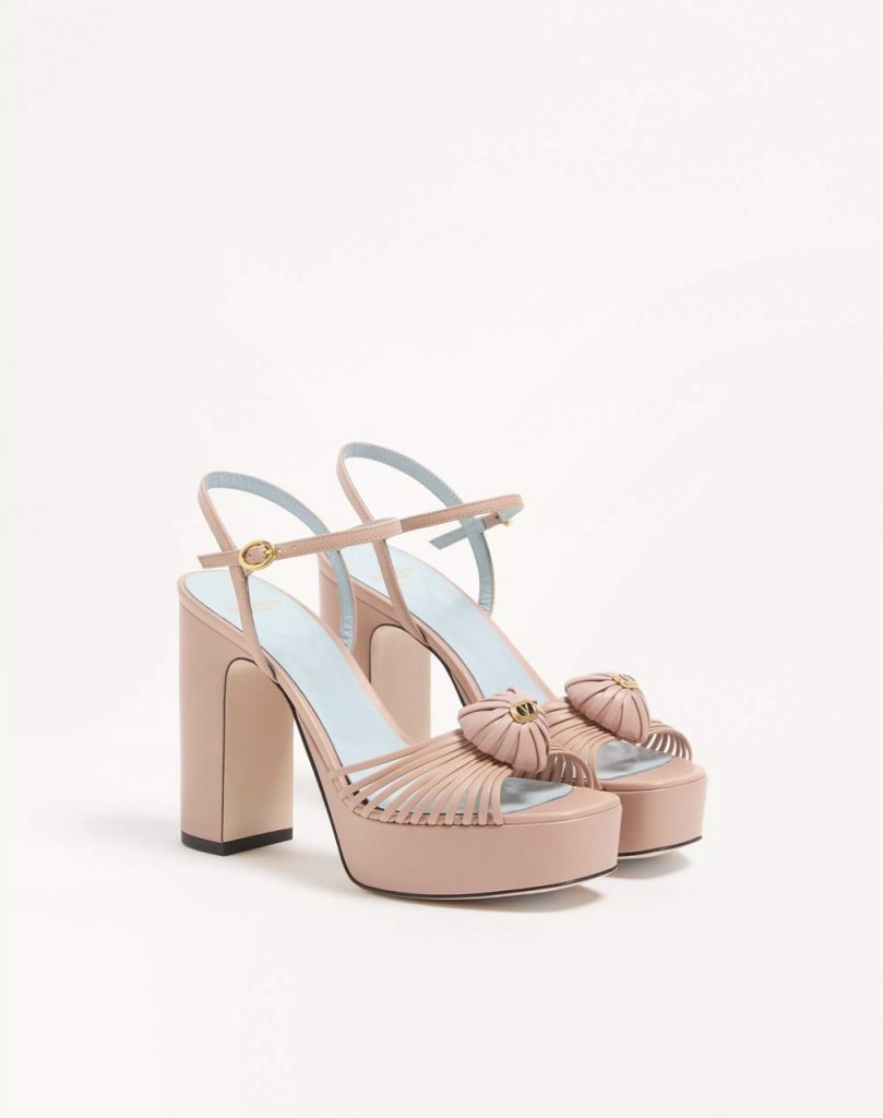 The maison kicks off the new season with a signature platform sandal in supple V-shaped kidskin, accented with a heart wrapped in leather mignon and the famed VLogo in antique-effect brass. An adjustable strap and platform heel complete the design with striking presence.