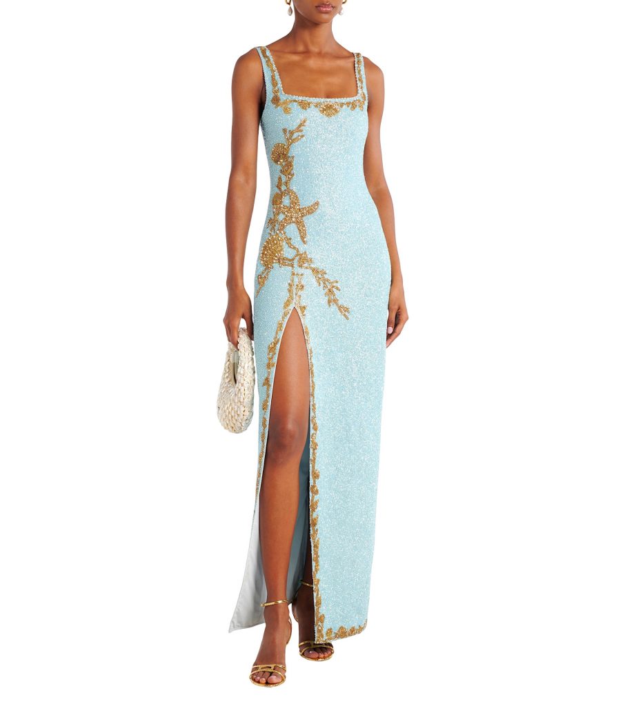A treasure trove of sparkle, this ethereal sky blue dress is far from the ordinary. It celebrates the magic of the ocean with its embellished seashell and starfish motifs, while its siren-like profile elegantly highlights the figure, leaving all in your wake powerless to your beauty and charisma. $5,955, mytheresa.com
