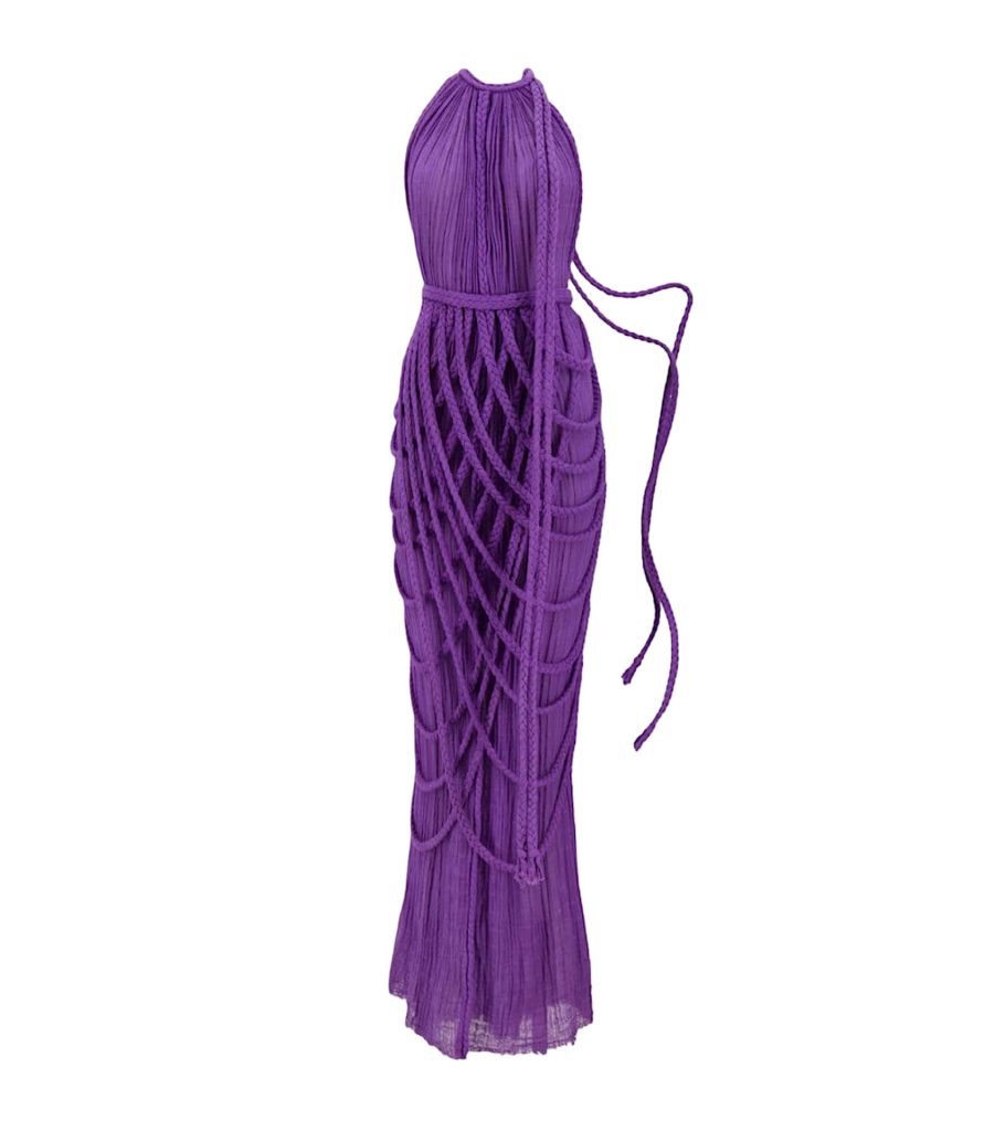 Celebrating size inclusivity, this violet stunner in a one-size-fits-all cut arrives in two pieces. By utilizing the braided detailing in several possible variations, the dress can be worn in a multitude of ways to create the perfect fit for many body types. Handweaving produces the eye-catching cascade finish. $856, cultmia.com