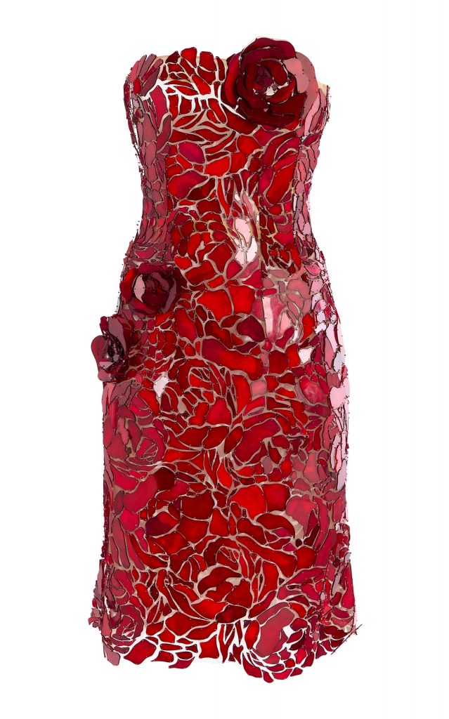 A study in craftsmanship, this strapless tulle cocktail mini spotlights glass-like mosaic embroidery and sculpted floral appliqués throughout, while its form fitting outline delivers high-impact allure. Pair with rose red accessories for a striking monochromatic look. $13,590, saksfifthavenue.com