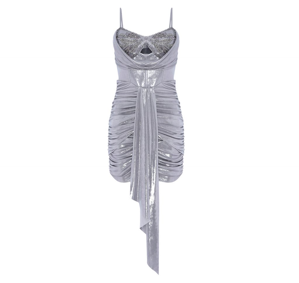 Short, sweet, and shiny, this slinky little number flaunts an underwire ornamented bust, adjust able straps, and a draped corset-structured bodice that sculpts the body. The skirt bottom is ruched throughout and enhances curves, while a hanging sash adds movement. $675, patbo.com
