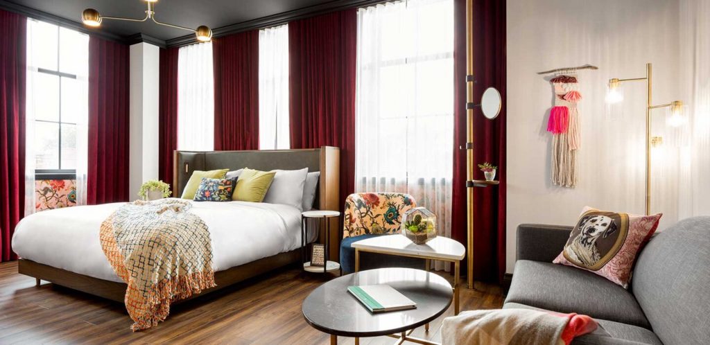 For a laid-back landing in Toronto’s hip East End, The Broadview Hotel is an architectural and cultural chameleon where Romanesque Revival grandeur wiggles its way into funky, modern flair. Set in an 1891 landmark, the charming boutique features 58 eclectic, richly appointed guestrooms – expect Eurotop beds, original brick walls, cheeky vintage wall paper, and fully stocked minibars loaded with local goodies. Some rooms offer expansive outdoor terraces with sweeping views over the city and Don Valley River. The ground-floor Bistro + Bar serves brunch and all-day bites amid towering windows, but for the best views in the house, grab a mango margarita on the glass-enclosed rooftop, finished with a pyramidal skylight. thebroadviewhotel.ca