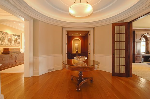 Set a third of a mile from its access road in Rumson, the house sports unique windows framed in brilliant white and some with dark green shudders; the main level is stone, giving way to the shingled upper floors, the roof peaking in many areas, chimneys rising above, with a domed window over the main entrance. The property is built for privacy, secluded on all sides and with its lush gardens, stone walls, and private dock. The residence features classical rotundas on each floor, vast archways, soaring ceilings, unique arched and circular windows, barrel ceilings, and abundant use of columns throughout— making it grand, yet accessible.