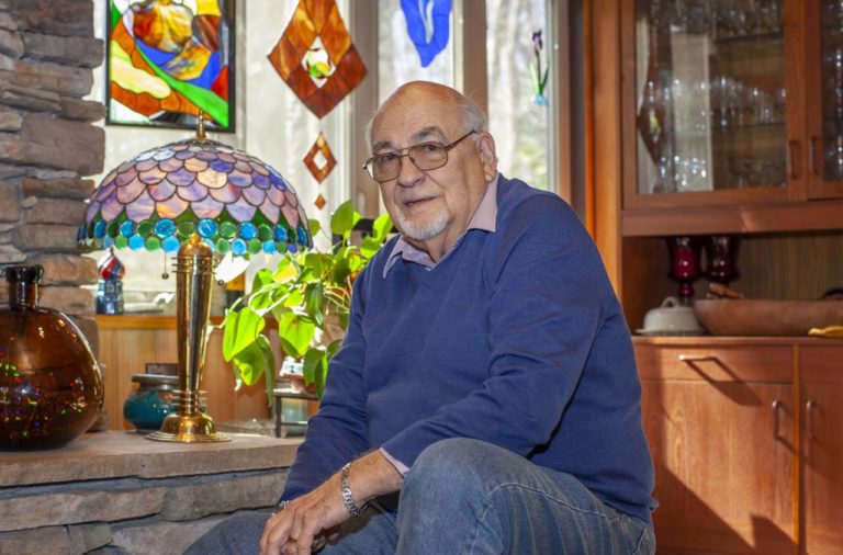 “I use the minimal amount of lines to support the structure and [that makes] it more attractive,” he explained. A series of 24″ x 24″ pieces depicting trees, for example, are both remarkable and dimensional pieces of art. The pair of stained glass inserts he made for a door, meanwhile, displays graceful flowers rising from variegated green leaves and a realistic depiction of blue waters. Another piece combines driftwood with stained glass green leaves in a branch like design.