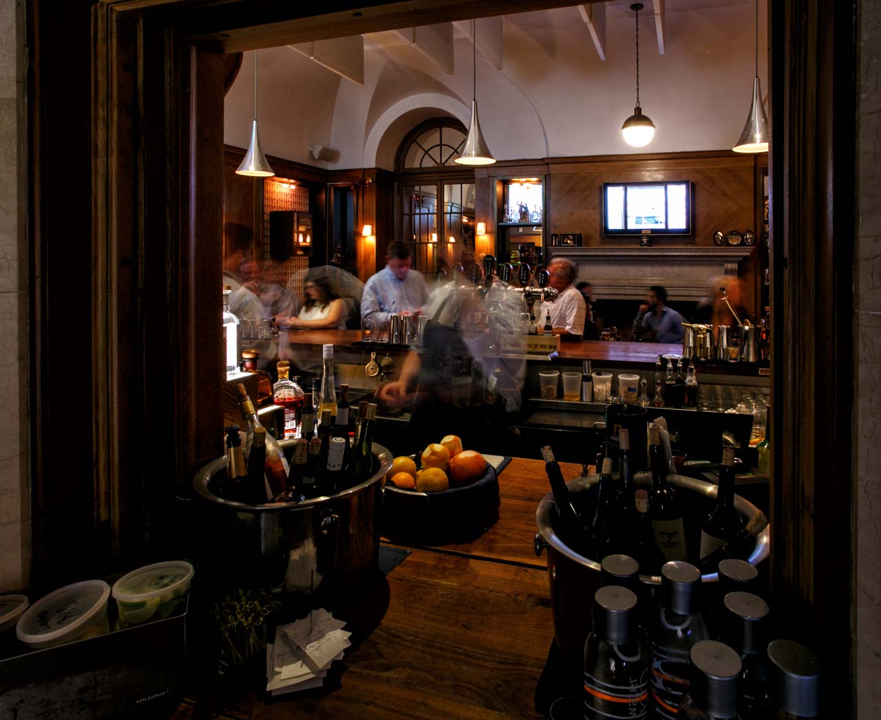“With its dividing central staircase and several separated rooms, it wasn’t built to be a restaurant,” he said. “But when we did the original walkthrough, I could picture how to use each space. I envisioned an oyster bar enclosed by those big columns and envisioned a beautiful cocktail bar in a back room that featured wood panels and a fireplace.”
