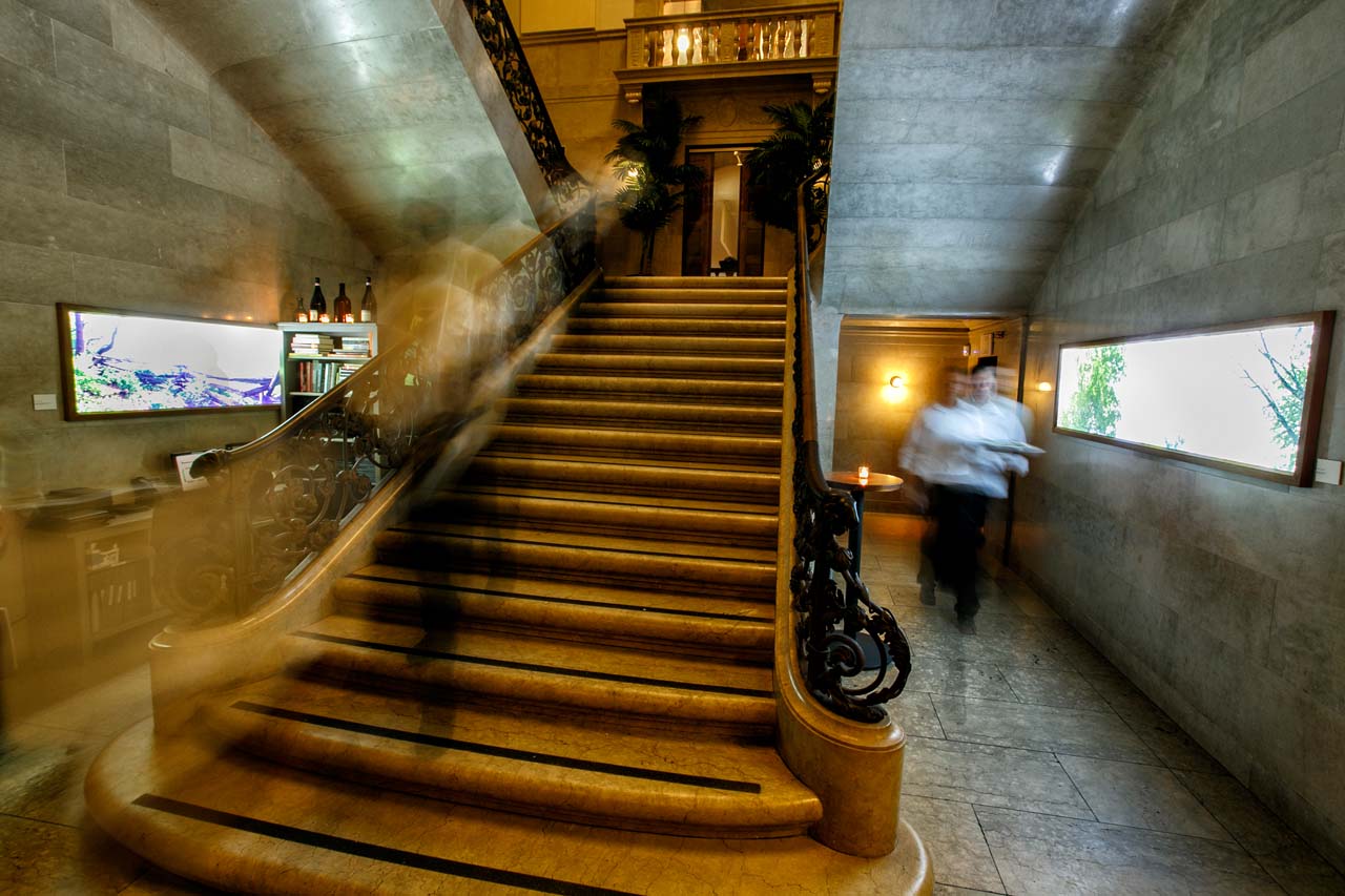 Guests are greeted by a grand marble staircase which leads to a 75-seat formal dining room. There, regional, sustainable farm-to-table food is served in a fine-dining atmosphere.