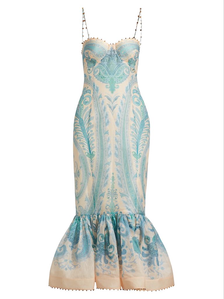 Showcasing a romantic paisley print and a figure-flattering mermaid flounce hem, this gorgeous frock radiates ethereal elegance for special occasions. Crafted of linen and silk, it boasts a sweetheart neckline with molded cups and adjustable beaded straps. $1,750, zimmermann.com