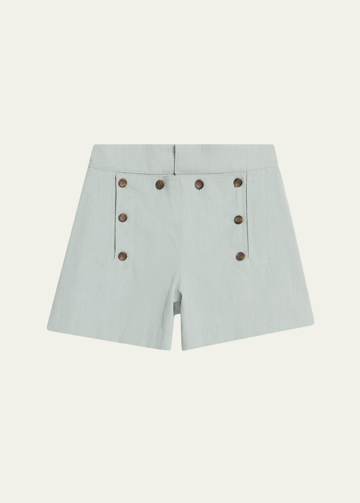 A nod to nautical influences, these tailored shorts in a silver blue hue are cut for a loose fit and decorated with a sailor-style button panel. Made from breathable cotton-linen that adds a natural texture, the structured shape can be complement ed with a fitted knit. $425, saks.com