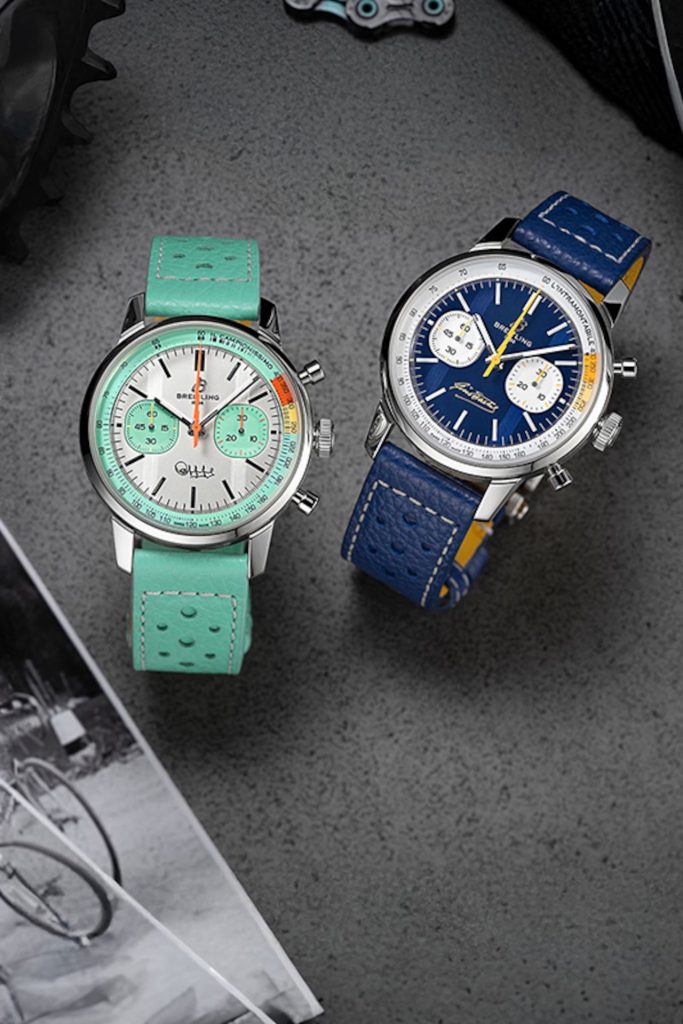This Breitling standout masterfully blends retro racing style with high-performance engineering. Inspired by cycling legend Fausto Coppi, this limited-edition chronograph features bold turquoise subdials, a vibrant lightning-shaped seconds hand, and elegant nods to Coppi’s legacy including his nickname “Il Campionissimo” and signature on the dial. Finished with a transparent caseback, this 41mm timepiece is both a collector’s dream and a celebration of sportsmanship, precision, and enduring style. Only 750 made. $7700