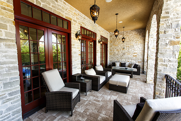 The great room, two steps down from the kitchen, has three sets of French doors out to the veranda. (“I love this veranda, it’s so pretty,” Barbara shared.) The room has a comfortable couch for the family to enjoy a night by the fireplace, at the center of the room’s focal point, a signature stone wall.