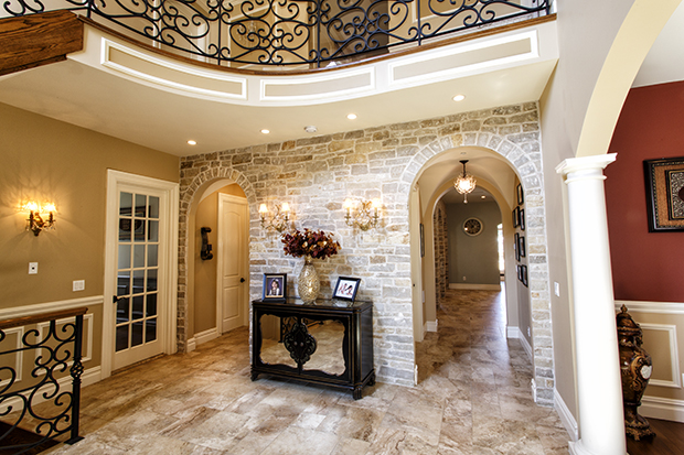 The result is a five-bedroom, six-bathroom home with all of the luxuries one would expect from a custom build. It has a gym, gourmet kitchen, swimming pool, theatre, and custom finishes too numerous to list. The project took two years to complete. The home welcomes visitors with a beautiful, rustic stone wall behind a custom iron front door. Arched stoneways beyond the entry foyer are warm and inviting.